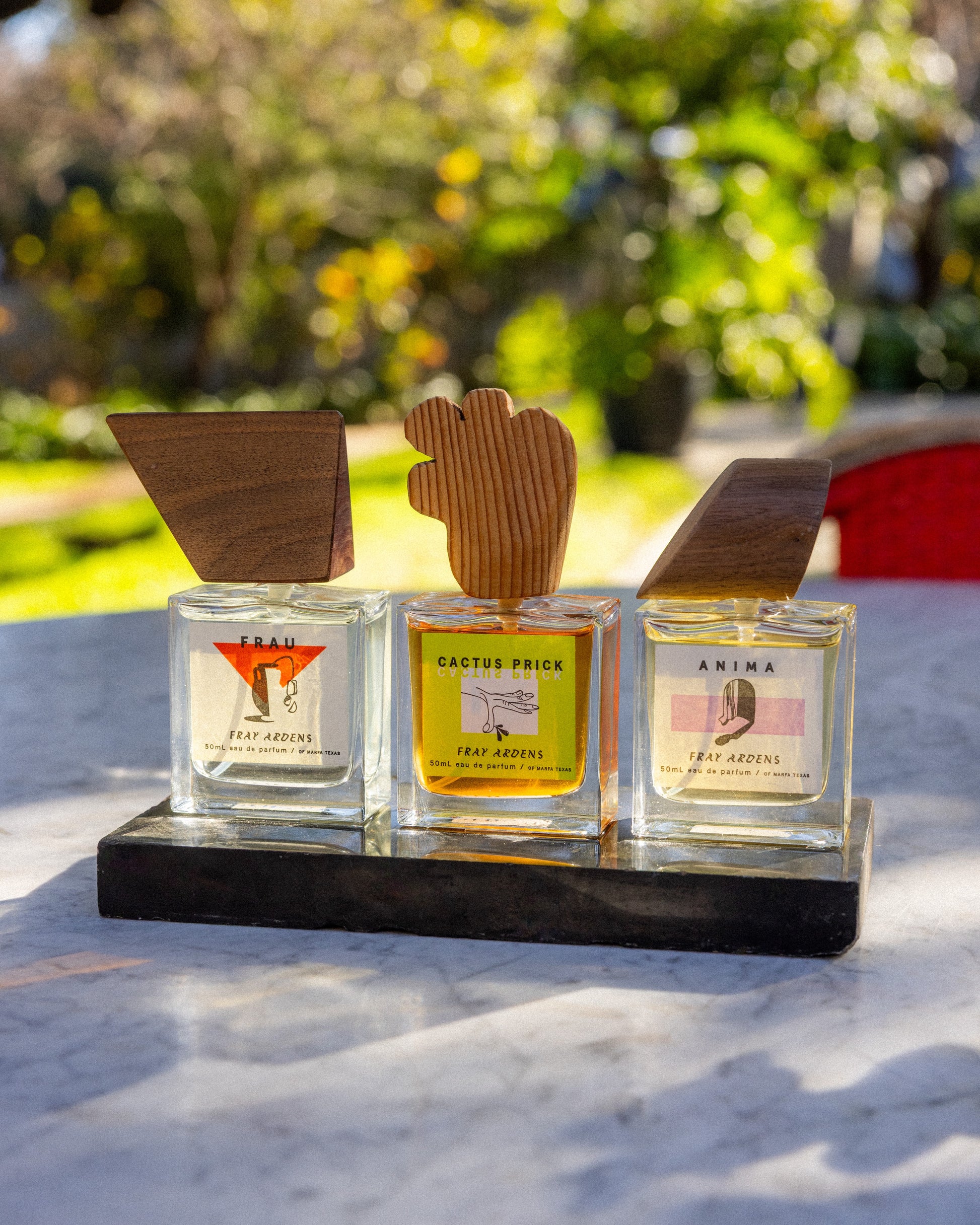The 50ml eau du parfum (suspended in denatured alcohol) features a walnut top designed by Marfa artist Camp Bosworth. Also available in 10ml rollerball (suspended in fractionated coconut oil) or 2ml mini spray sample (of the eau).